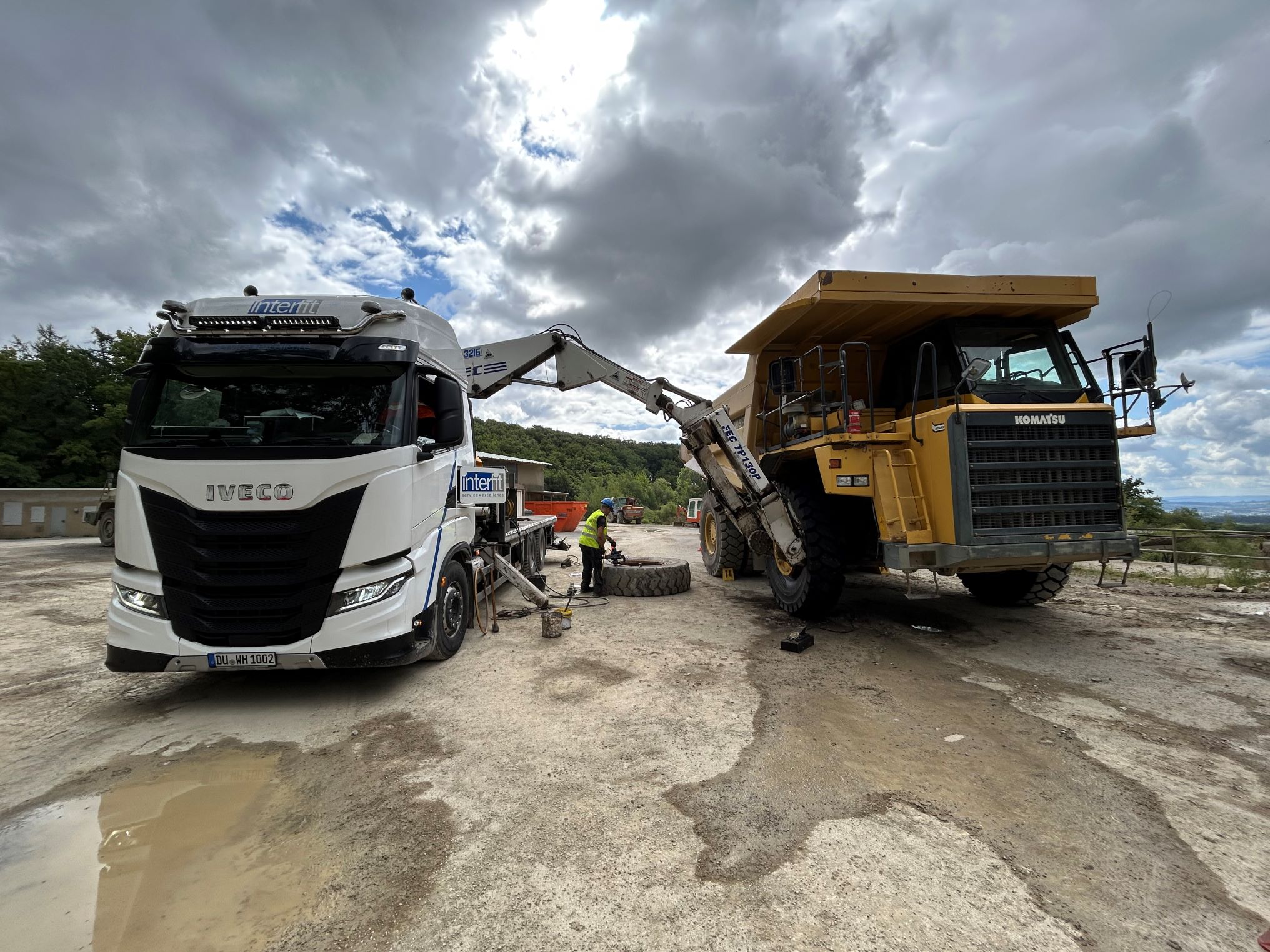 Through our fleet of service trucks with tyre handling arm, we provide tyre fitting services. We reach construction machinery wherever they are to provide comprehensive, fast and efficient tyre replacement, service or maintenance. For further information